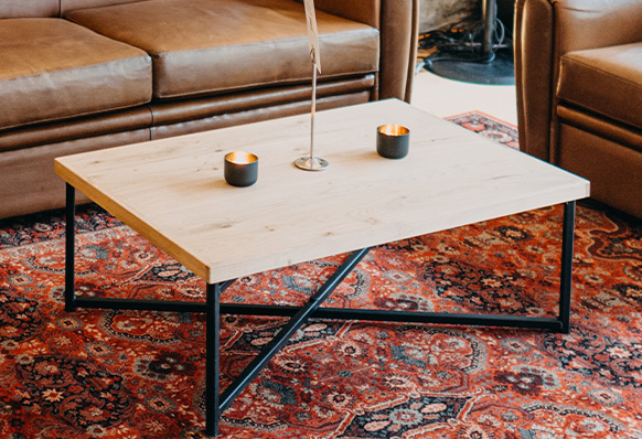 Notre canapé et nos fauteuils club en cuir marron, au cœur de cet espace convivial, offrent un grand confort et une élégance intemporelle. La table basse en bois, avec ses pieds en métal noir, apporte du contraste avec ses matériaux à la fois naturels et industriels. La surface en bois massif apporte une chaleur indéniable, tandis que les pieds en métal ajoutent une touche contemporaine. Cette table est le point de rencontre idéal pour déposer vos livres, boissons et objets décoratifs. Le tapis vintage, disposé sous le canapé et les deux fauteuils club, ajoute une note de charme ancien. Ses motifs subtils et ses couleurs apaisantes évoquent une nostalgie douce, renforçant ainsi l'atmosphère chaleureuse.