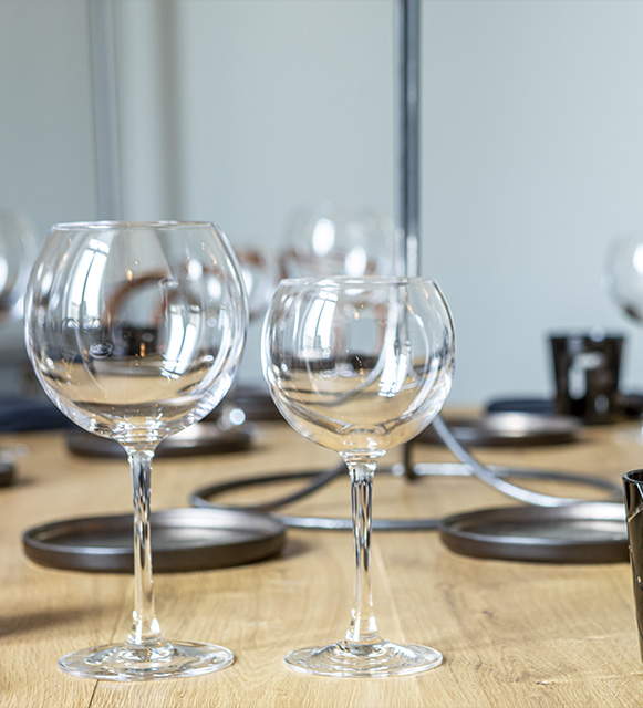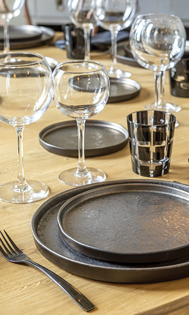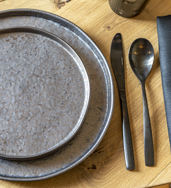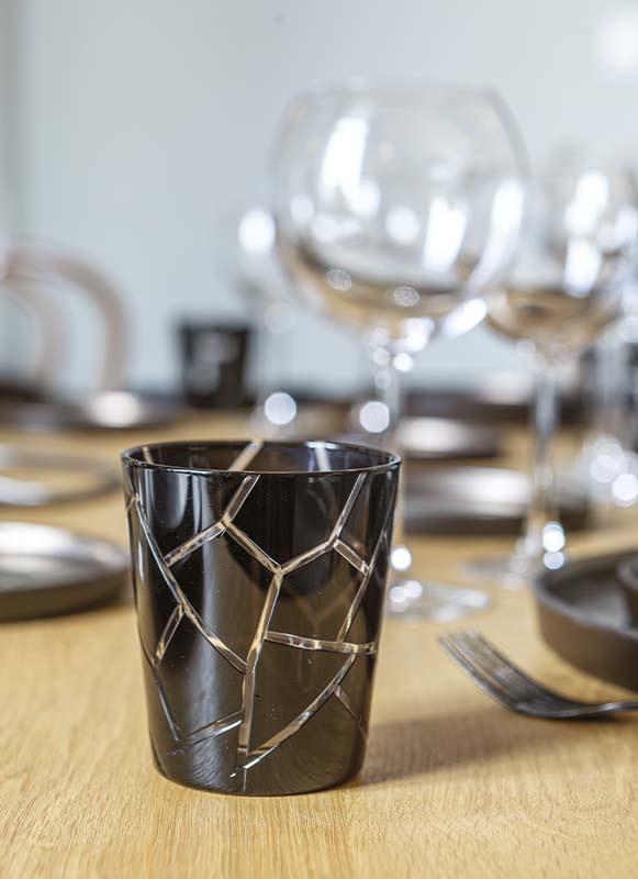 L’alliance du métal et du bois crée une unité de style et d'esthétique. Le métal présent sur les trois pieds de la table s’accorde avec le chandelier et avec l’allure brute de la ligne d’assiettes Tungsten. Les gobelets Mélodie noirs affichent leurs différents motifs et sont complétés de la serviette de table chintz noire.