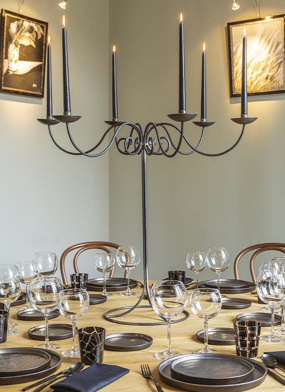 Pièce maîtresse de cette inspiration de table, ce majestueux chandelier suffit à habiller la table ronde Nature et attirera tous les regards !