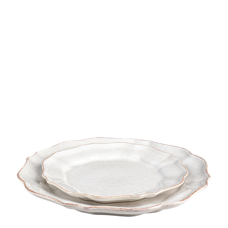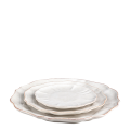 La ligne d'assiettes Romance apportera sophistication et charme à votre table. Avec ses bords patinés et festonnés, en grès fin, elle se marie idéalement avec la ligne de couverts Nacre.