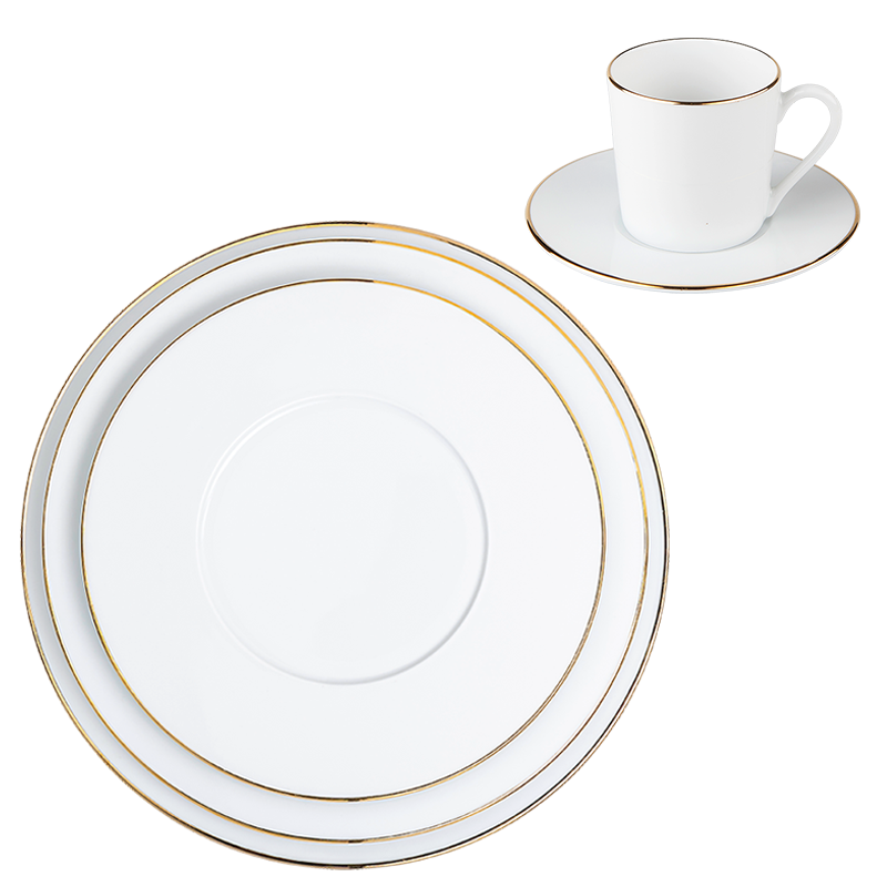 Cette ligne d'assiettes en porcelaine blanche avec filet or permet de dresser une table sobre et élégante, dans les tons blanc et doré.