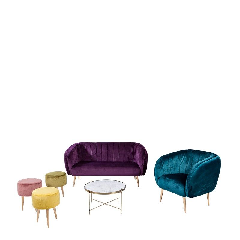 Pour créer un décor moderne et un coin lounge unique et tendance : ce sera avec le canapé Juliette aubergine, en velours aux pieds dorés. Ce canapé existe également en couleur bleu vert. Il fait partie d'un ensemble lounge, qui se compose de canapés, fauteuils et poufs. Dimensions : P 78 x L 165 cm H 85 cm