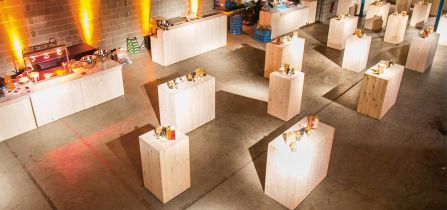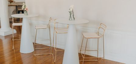 Dans cet aménagement spécialement conçu pour un espace cocktail élégant et sophistiqué, couleurs et textures se combinent pour un effet visuel captivant. Les mange-debout croisés en acier avec plateau bois complètent parfaitement cet ensemble, ajoutant une touche d'originalité et de style.