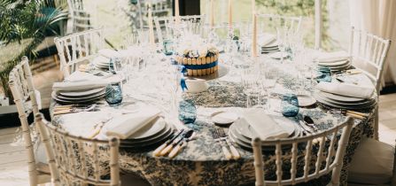 Le vert amande du nappage en lin convient tout à fait pour un déjeuner. Le chemin de table composé d’eucalyptus apporte une note de fraîcheur à cette belle table printanière. Cette disposition sur une table rectangulaire est idéale pour une réception de mariage dans les tons verts ou un événement professionnel en petit comité.