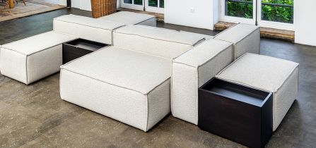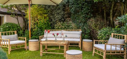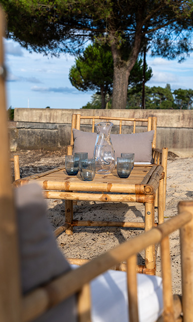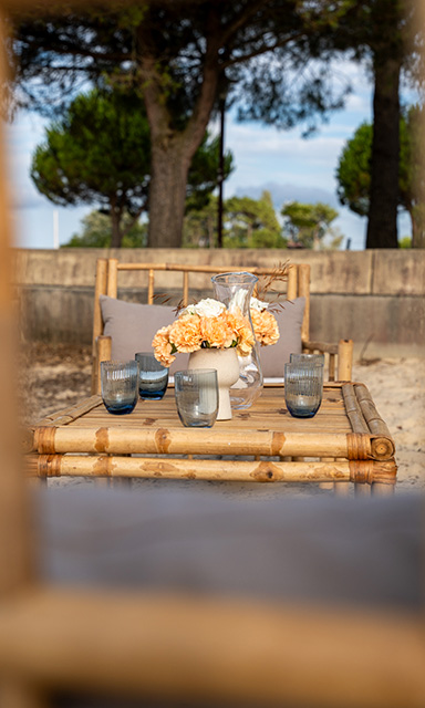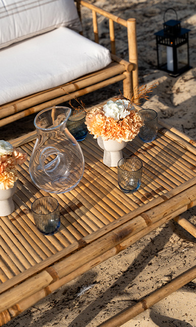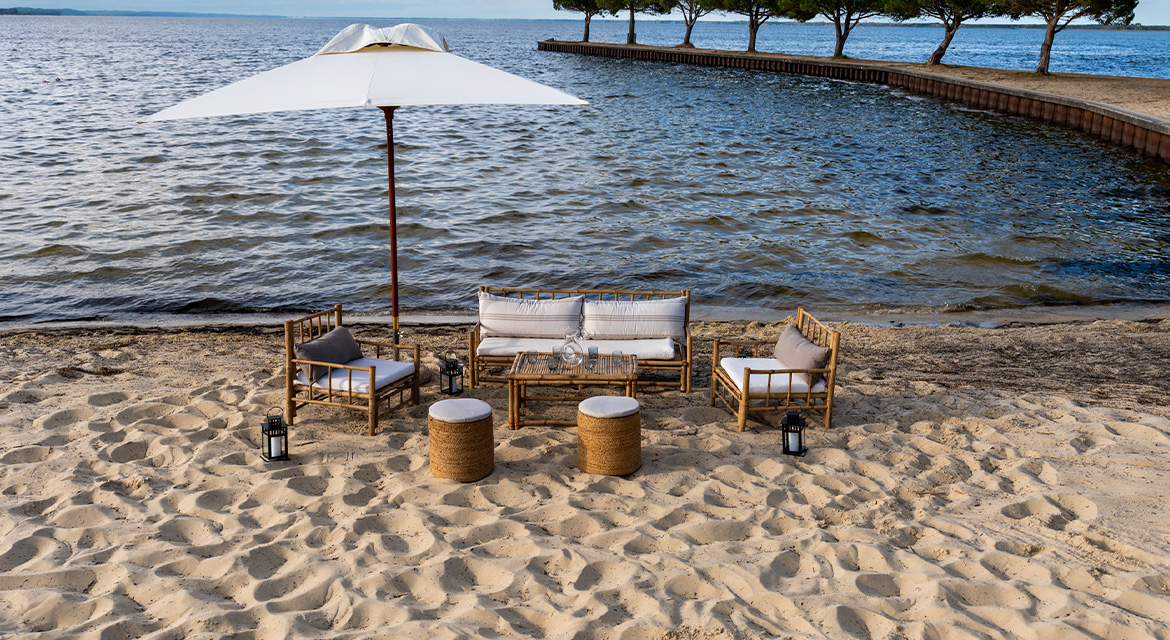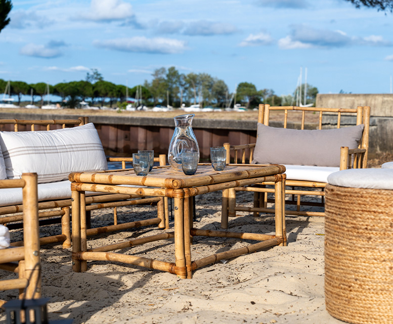 Notre lounge Bali, installé sur le sable doré, invite à la détente avec ses assises en bois naturel réhaussées de ses coussins moelleux et ses lanternes disposées avec soin. Sous l'ombre du parasol Louisiana en toile blanche, l'ambiance est à la fois décontractée et chic, offrant un cadre parfait pour un véritable moment de repos.