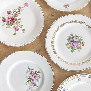 Voici la vaisselle Vintage que nous proposons à la location. Vous trouverez des assiettes dépareillées dans différents motifs harmonieux, mais aussi des verres de tailles et formes variées.