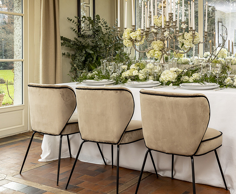 Nos assiettes « perle nacrée » dévoilent leur look bohème chic et original. Associées avec les couverts argentés Trianon, le design romantique de l’Art de la table prend l’ascendance. Les chaises Dandy taupe viennent envelopper cette ambiance avec leurs formes confortables et leur coloris chaleureux. En assortissant ces chaises avec le canapé Elton, le mobilier inscrit cette table dans un charme et un style moderne.