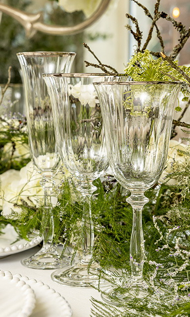 L’élégance des verres Marquis or et le décor de fleurs consolident l’allure romantique et naturelle de l’ensemble.