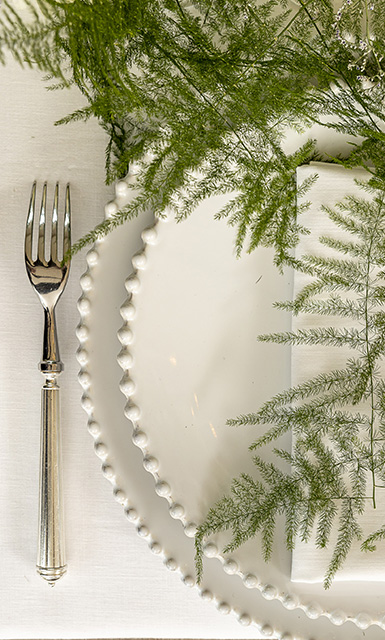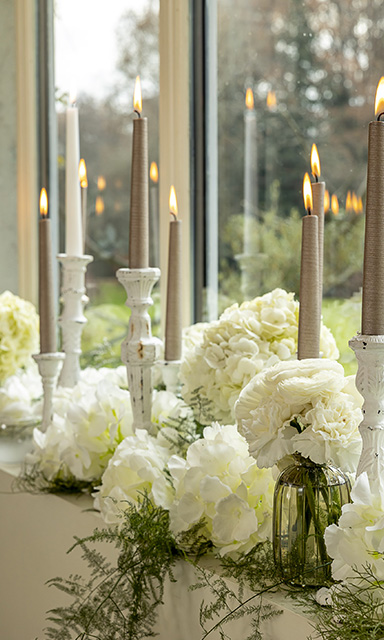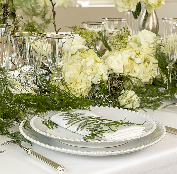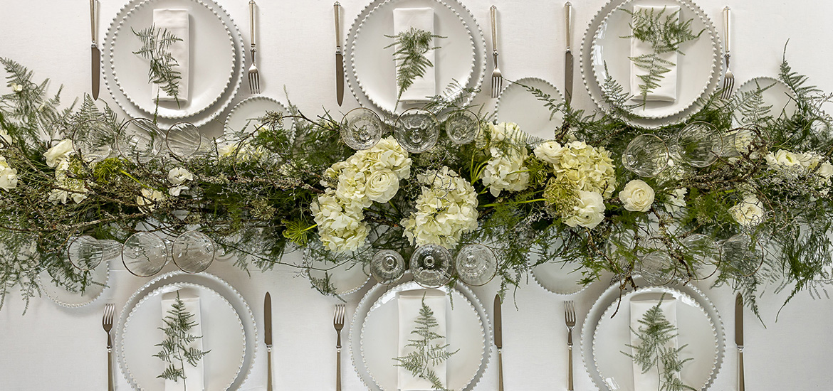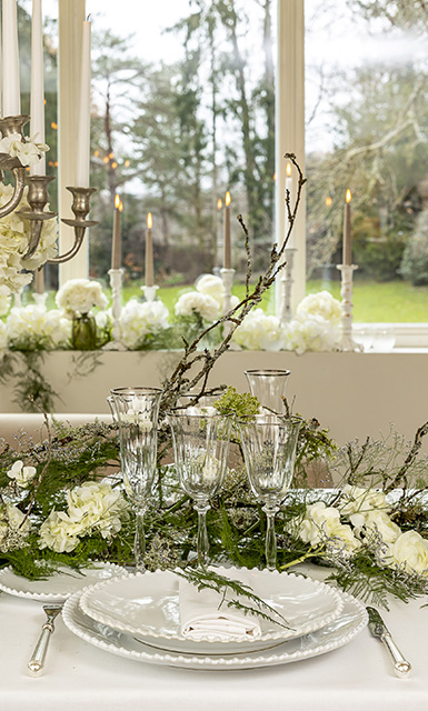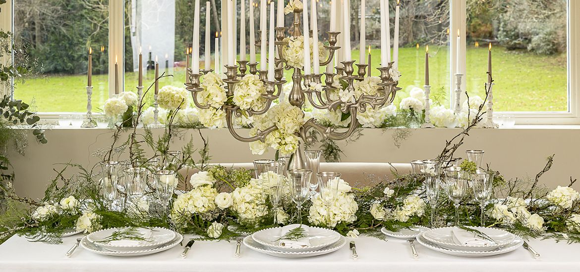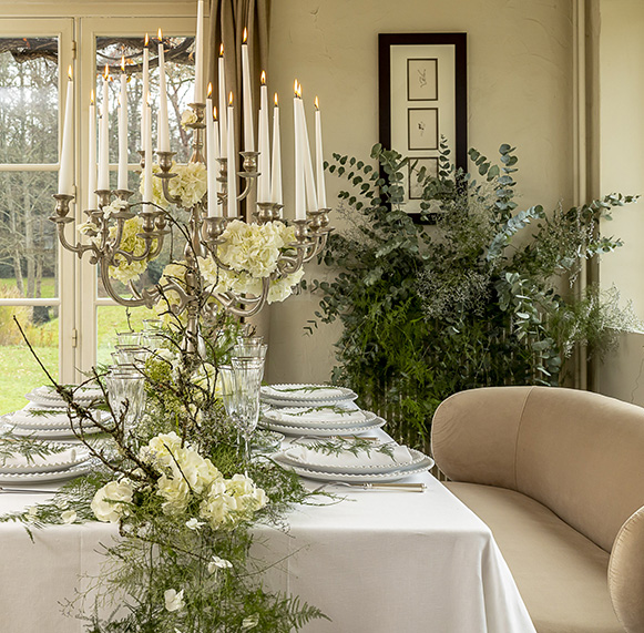 Sous ce majestueux chandelier à la silhouette aussi merveilleuse qu’imposante, c’est la douceur qui domine dans cette représentation d’une table de conte de fée moderne.