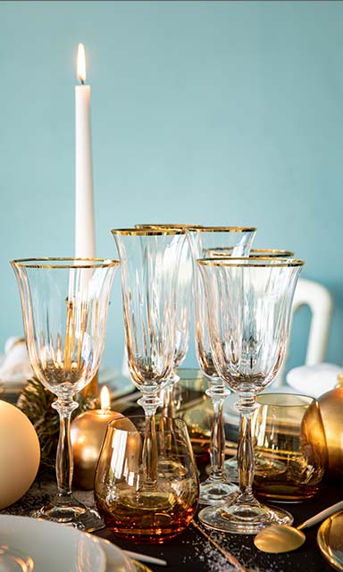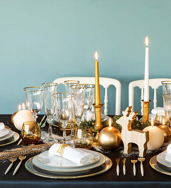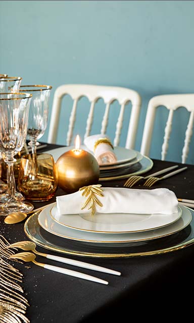 La touche finale apportée par les gobelets Moon ambre et les ronds de serviettes César permet de diffuser la flamme étincelante des flambeaux positionnés sur les bougeoirs vintage dorés, rappelant l’éclairage qui constelle les foyers dans l’attente de l’arrivée du Père Noël.