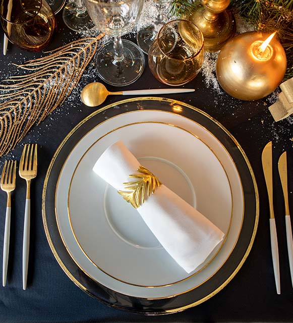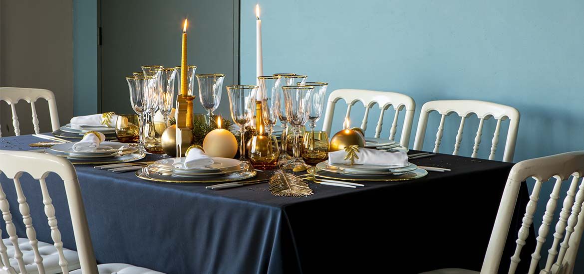 La magie de Noël est de retour sur nos tables ! Nos scénographes ont dressé pour vos repas de fête une table moderne et scintillante, en associant les assiettes Beverly et Filet or, les verres Marquis Or et les couverts Cutipol. Tout en mixant avec élégance la sobriété du blanc et du verre avec la flamboyance du doré. Le tout est disposé sur la nappe Toscane bleu nuit.