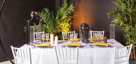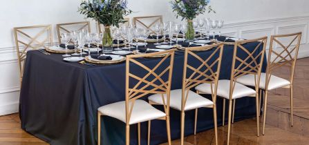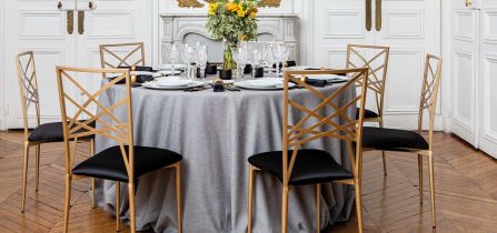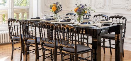 Avec un art de la table aussi riche que généreux, créez une ambiance feutrée et chaleureuse autour de votre évènement. Les chaises Napoléon s'accorderont au noir des tables laquées tandis que les flammes des bougies feront ressortir le strass des assiettes. N’hésitez pas à mixer les couleurs de ces dernières pour une touche d’originalité.