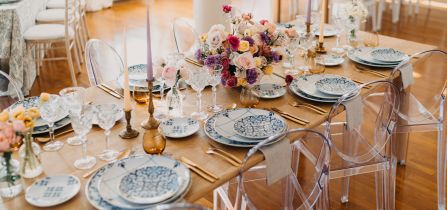 Les assiettes blanches Perle, d’une simplicité raffinée, apportent une touche de pureté et d’élégance. Les serviettes rose claire ajoutent une note de douceur. De part et d’autre, vous pouvez retrouver les couverts Cutipol blanc et or pour la touche ""luxe"". Les manches blancs et la partie supérieure dorée ajoutent une note de sophistication. Pour rappeler la délicate couleur des serviettes, les gobelets Milano sont légèrement teintés de rose. Au centre de la table, un somptueux bouquet de fleurs attire tous les regards, composé de lys majestueux et de fleurs assorties. Les lys, symboles de pureté et de passion, sont le choix parfait pour célébrer l'amour et l'engagement.