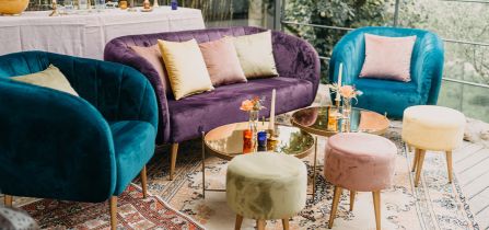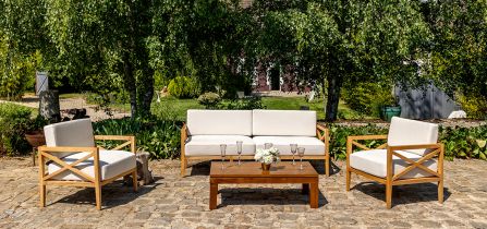 La gamme de mobilier de jardin Biarritz trouve parfaitement sa place à côté d’un mur de pierres. Les canapés et fauteuils, avec leur détail croisé et leurs coussins beiges, invitent à se détendre, à l’ombre d’un arbre. Sur une table basse en bois, simple et élégante, placez un petit bouquet et donnez la possibilité à vos convives de s’installer le temps de boire une flûte de champagne. Ici, nous retrouvons la gamme de verres Marquis Or, très appréciées pour les réceptions de mariage. N’oublions pas de prévoir les braseros, qui seront bien utiles à la tombée de la nuit.