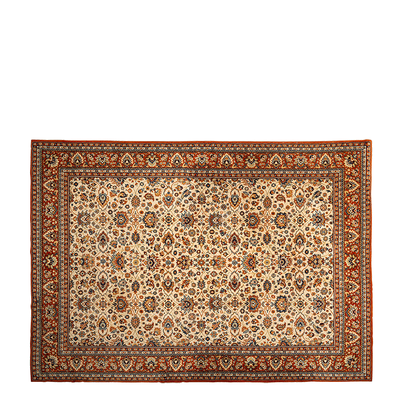 Dominé par les couleurs rouge et bleu, ce magnifique tapis est orné d'élégants motifs végétaux traditionnels entremêlés, d’arabesques et d’oiseaux typiques de l’art oriental.