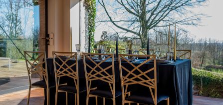 Déposés sur le plateau en marbre de la table, la carafe à vin ajoute une touche typique alors que les gobelets Mélodie en version noire et blanche diffusent leur dynamisme et leur originalité. Ces deux verres s’accordent parfaitement avec les motifs et lignes graphiques du tressage des chaises.